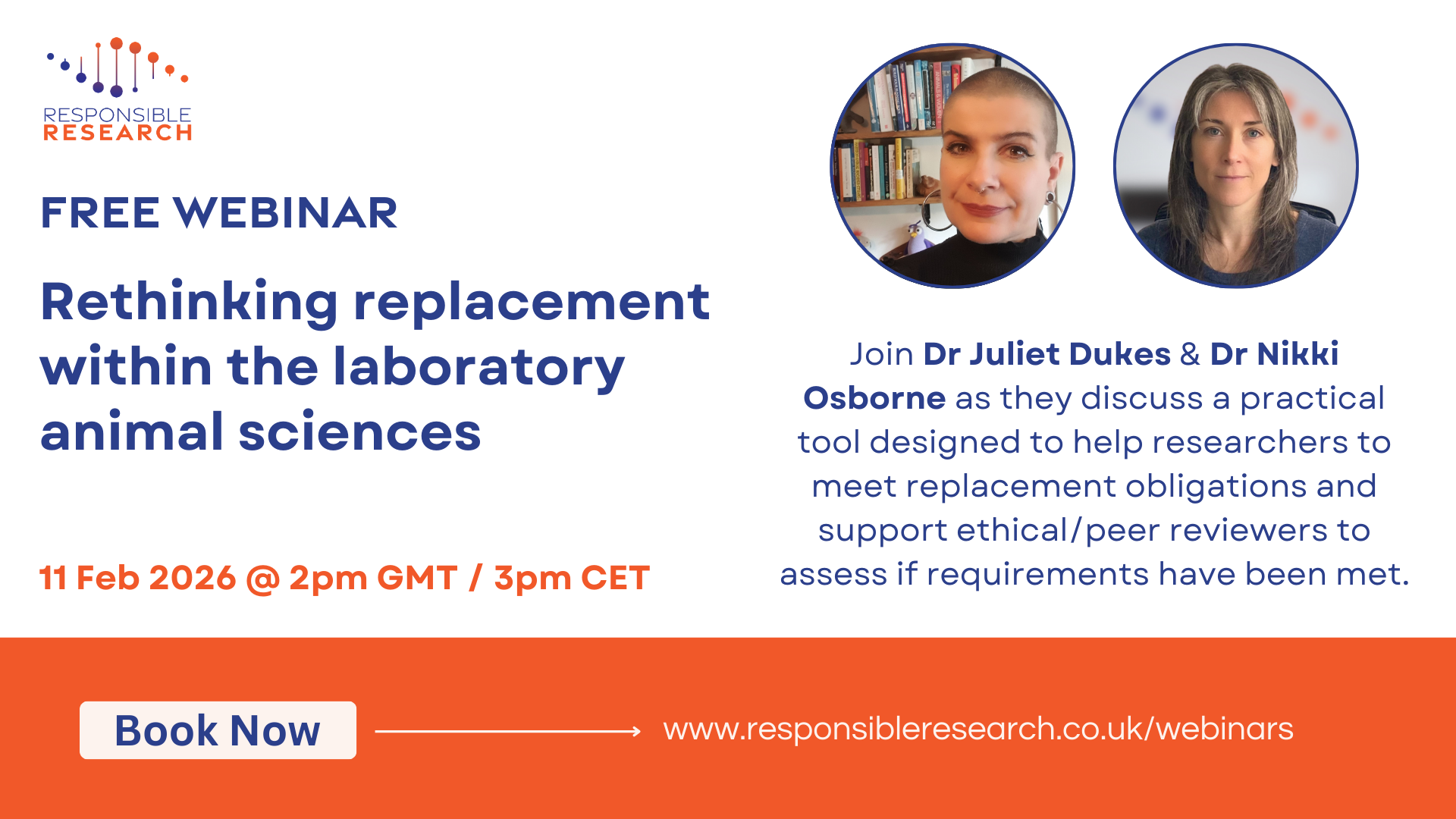 Join Dr Juliet Dukes and Dr Nikki Osborne for this LIVE responsible research webinar ” Rethinking replacement within the laboratory animal sciences “. During this session, Juliet (Research Manager, at Replacing Animal Research) will share practical tools including the Replacement Checklist – a tool designed to help researchers, ethical and peer reviewers, to know what is needed to show that replacement obligations have been met. She will also answer any questions that the audience may have. Attend this webinar to learn about: – the challenges associated with reviewing the R of Replacement; – the development of the Replacement Checklist tool; – how the tool can support better research, enhance communication, openness and transparency; – benefits reported by researchers, ethical and peer reviewers from using the tool; – where to go for more information.